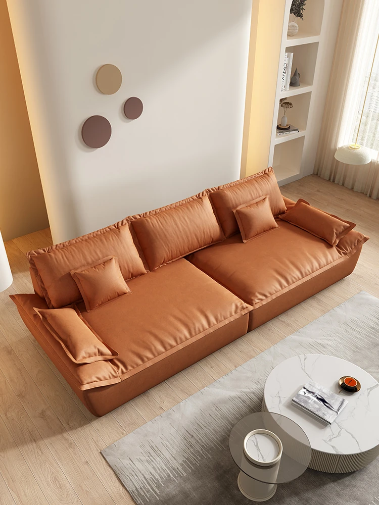 イタリアンヴィンテージ風オイルワックスレザーのシンプルラグジュアリーな中華風リビング用大型直線キャラメルカラークッキーソファ - 高級感と快適さを両立した一品!