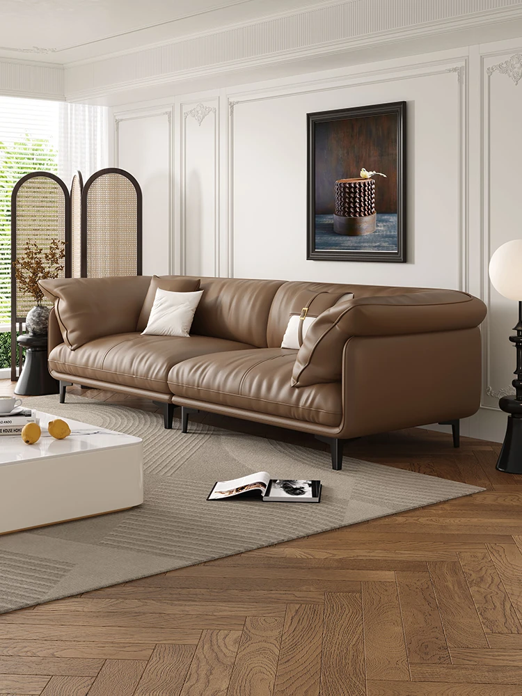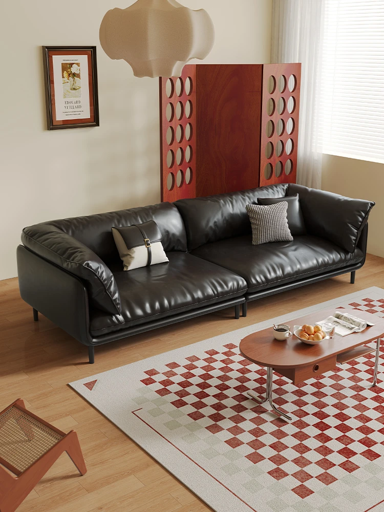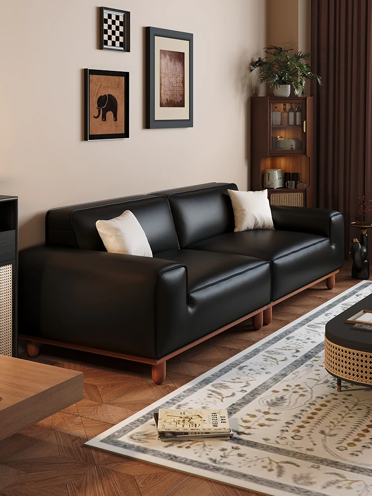 イタリアンレトロ風のライトラグジュアリーなブラックオックスキャットスクラッチレザーソファ:現代のリビングに最適なコンパクトサイズと高めの脚デザインが魅力の逸品