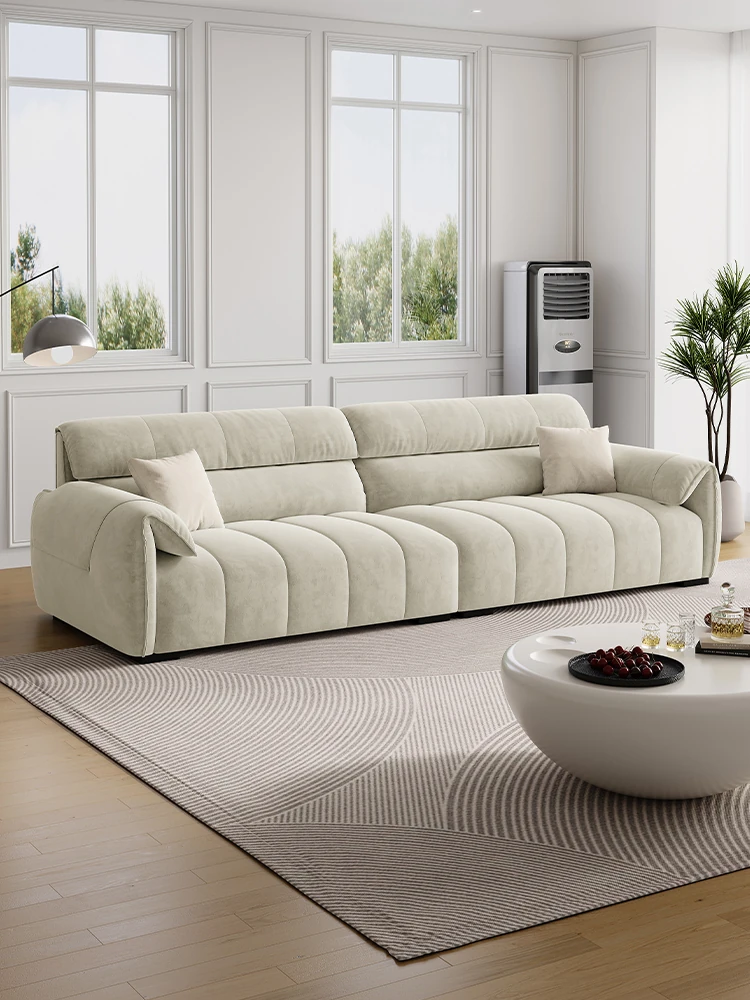 イタリアン・ミニマリストデザイン!クリーム風ベビーベルベットのコンパクトソファ-3~4人掛け、シンプルでエレガントなリビングにもぴったり。