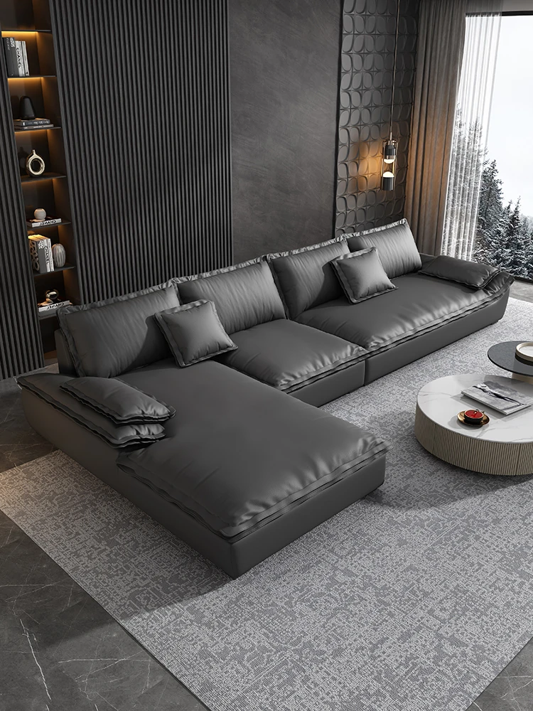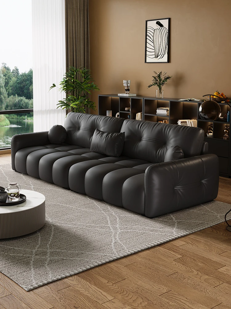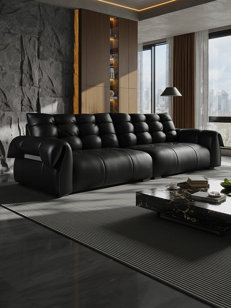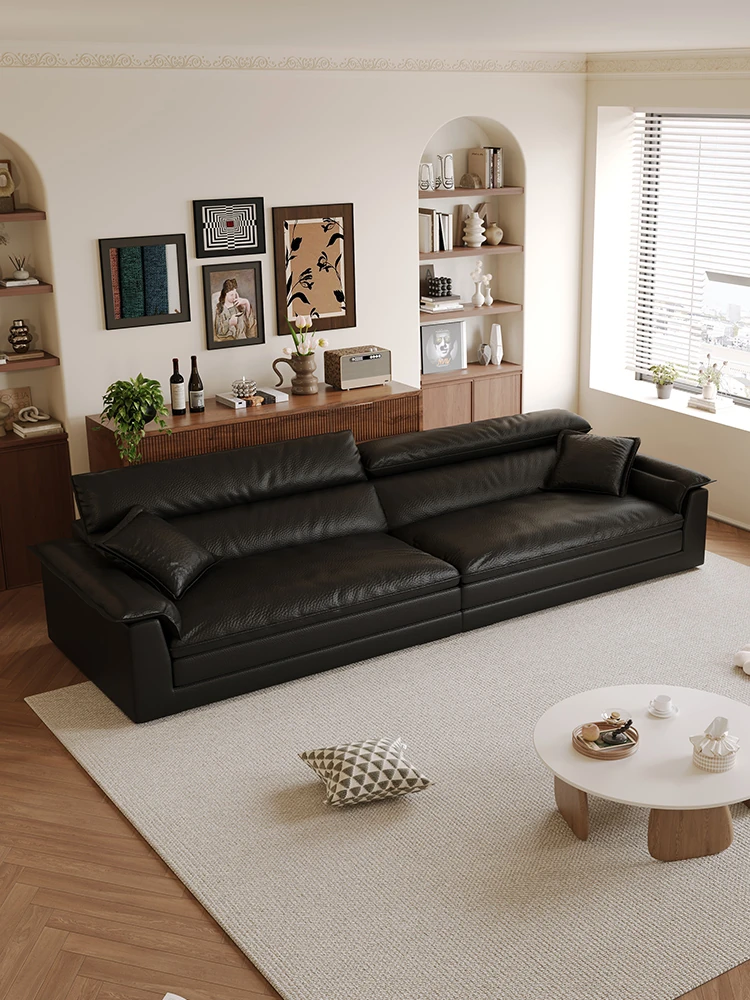 イタリアンモダンブラックの軽量高級本革ソファ - リビングルームにぴったりの真羽毛デザイン、大小のスペースに最適な北欧風シンプルソファ!