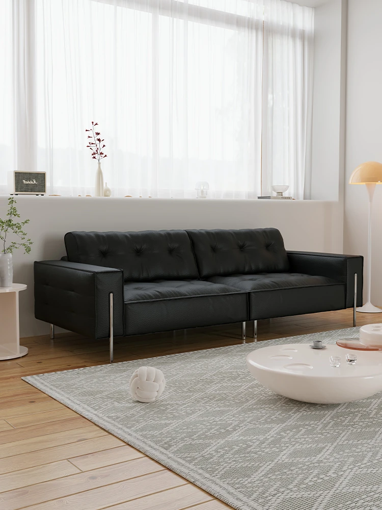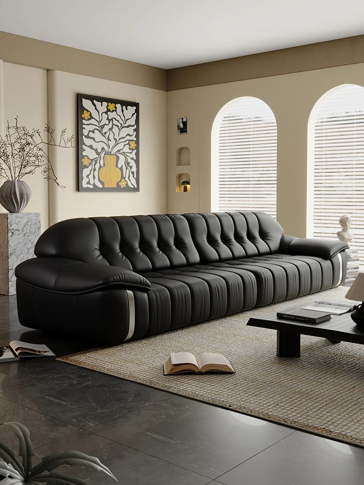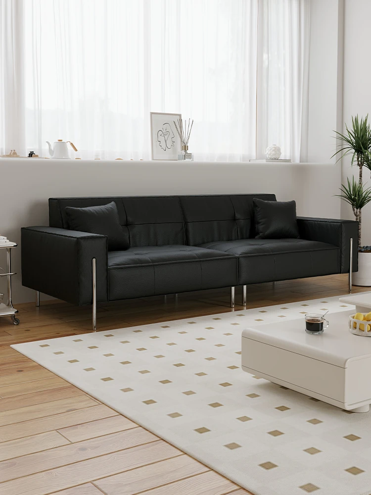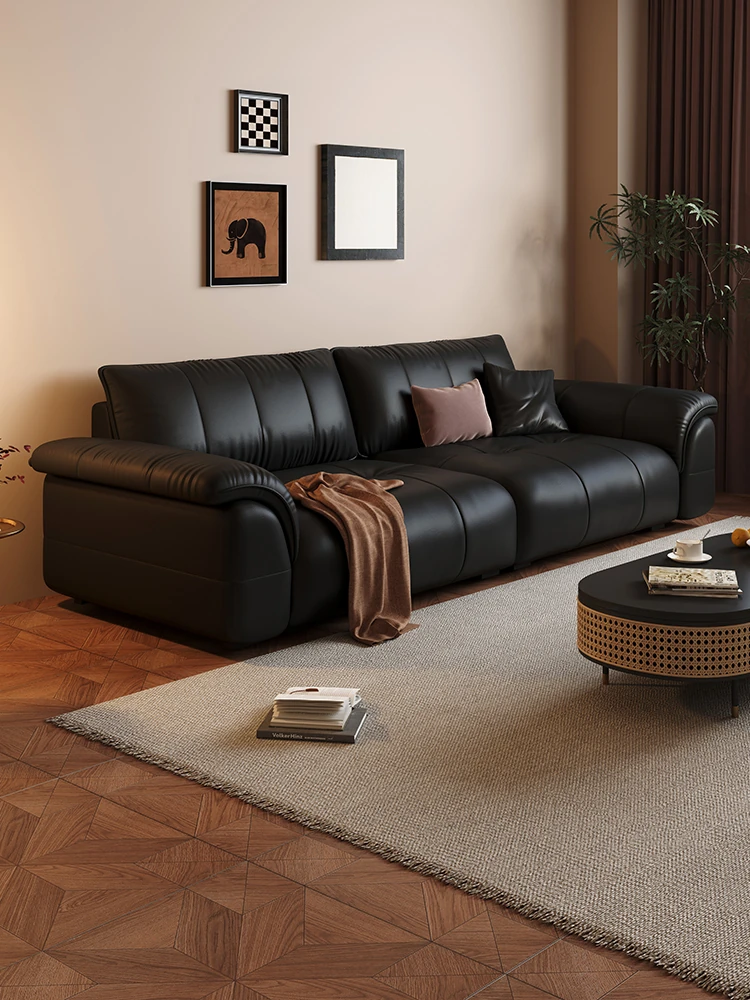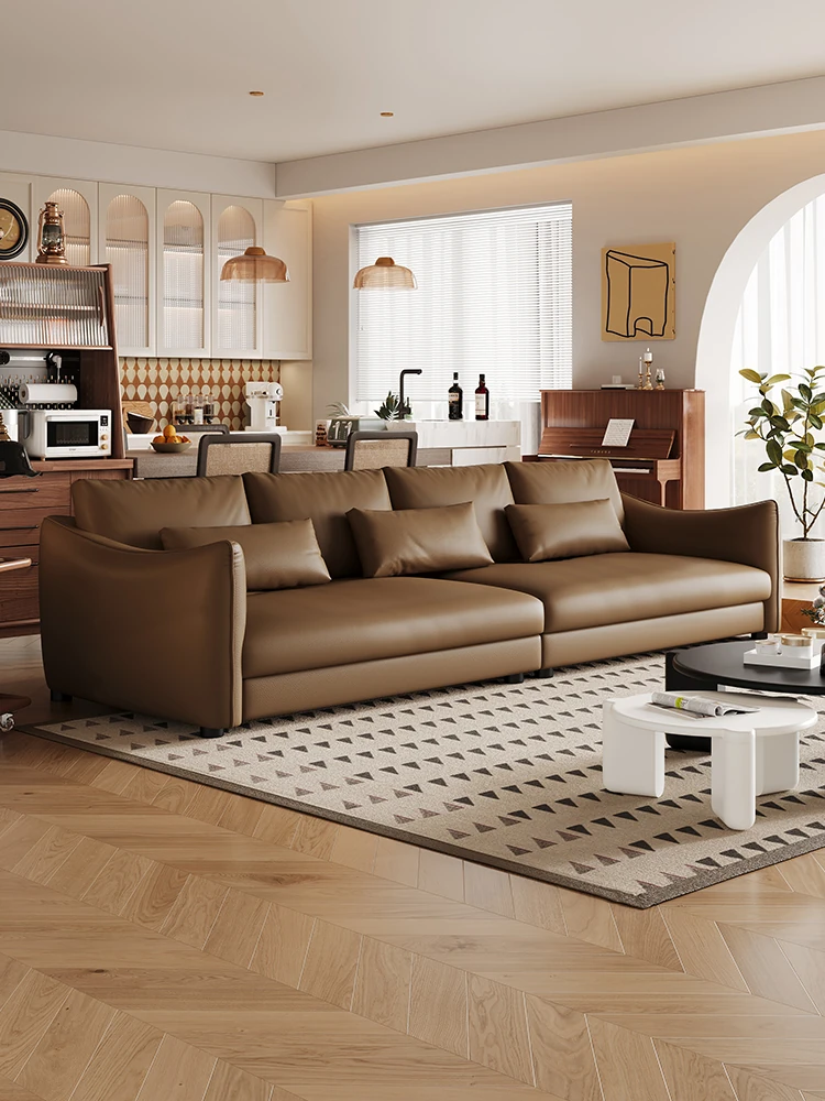2025年新登場!フレンチレトロスタイル オイルワックスレザーソファ - モダンでシンプルなデザイン、小型リビングにもぴったりのSNS映えするポップなストレートラインソファ