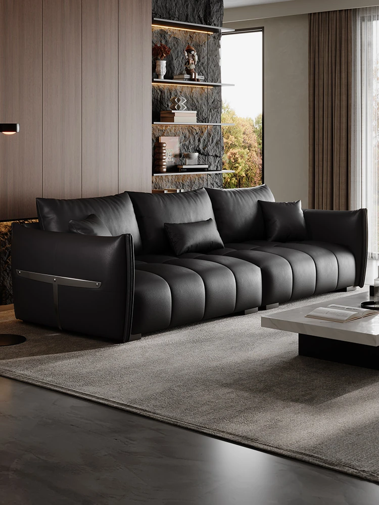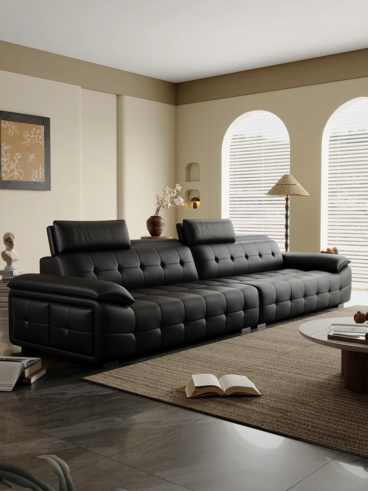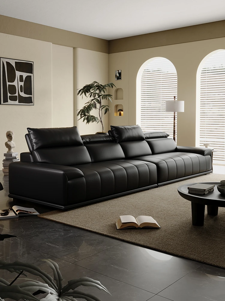 イタリアンミニマルデザインの猫爪対応本革ソファ - シンプルでラグジュアリーなリビングに最適、大型サイズ&調整可能なヘッドレスト付き直線デザインソファ