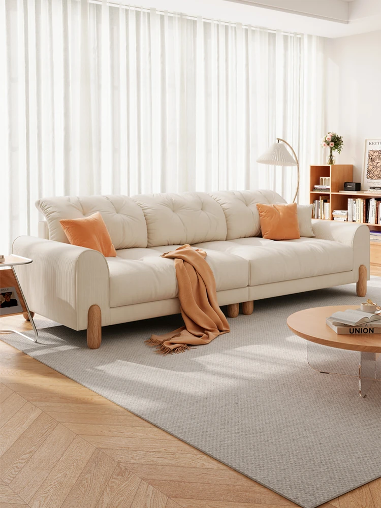【魅力满点】2025年新作!ナチュラルウッド&クリーム風味のマシュマロパフソファ。リビングにぴったりのモダンシンプルなストレートライン布製ソファセット!