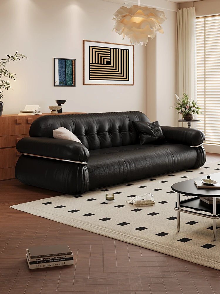 2025年新作!軽量でラグジュアリーなデザイナーズ直列スチールフレームの本革フランス風ヴィンテージブラックソファ - エレガントなリビングに。