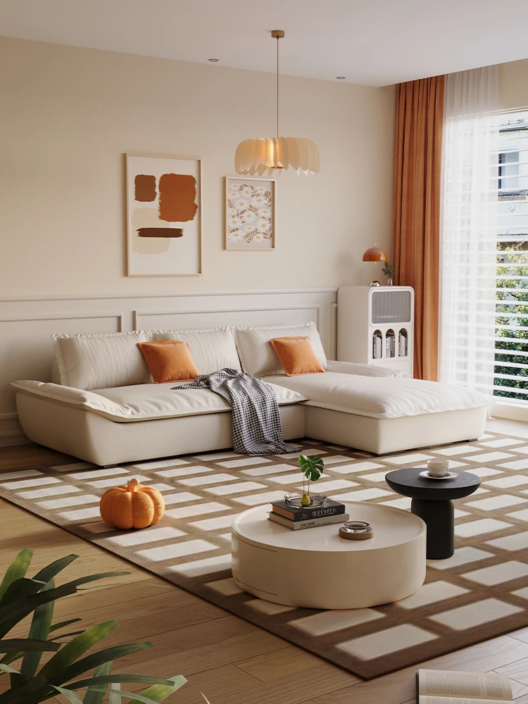 2025年新版!エレガントなフレンチクリーム調生地使用、北欧・イタリア風リラックス感溢れるラグジュアリーリビング用コンパクトコーナーソファセット