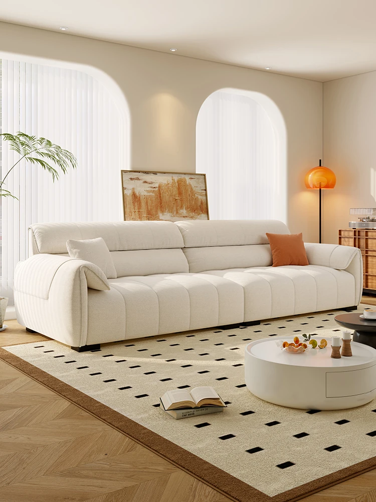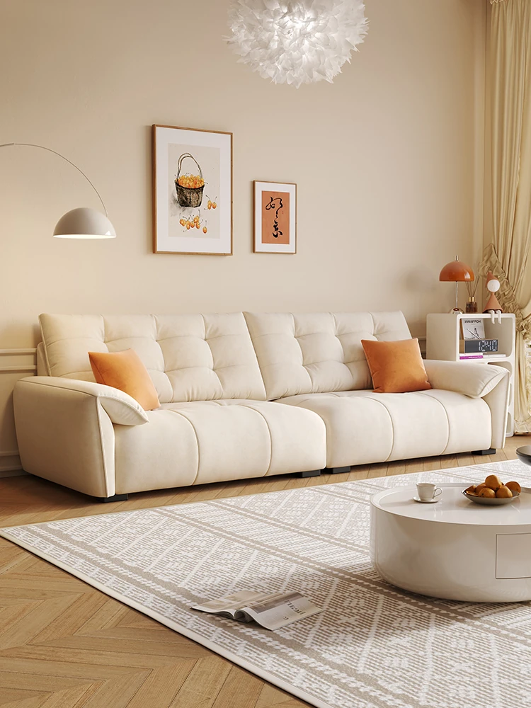 French Cream Style Small Living Room Sofa - Baby Velvet Arc Cotton Marshmallow Tofu Blocks with Piano Key Design. Cozy and Chic for Urban Living Spaces!