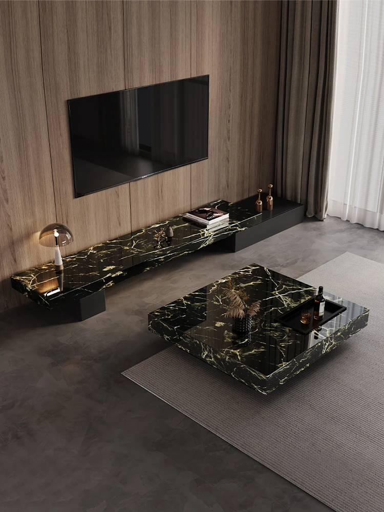 Italian Minimalist Luxurious Glossy Stone Coffee Table & TV Stand Set - High-End, Scratch-Resistant, Sleek Design for Modern Living Rooms