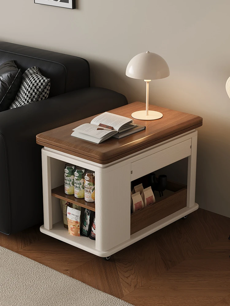 Modern Minimalist Multi-Functional Solid Wood Side Table with Wheels - Adjustable Height Rolling Sofa End Table for Living Room