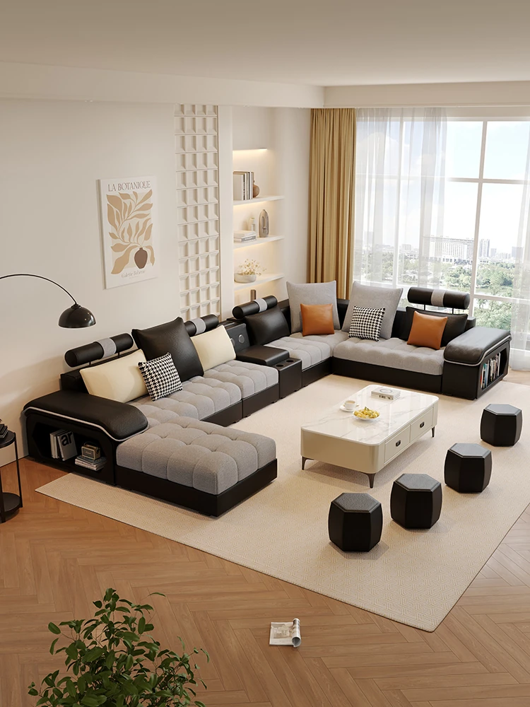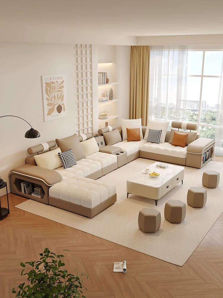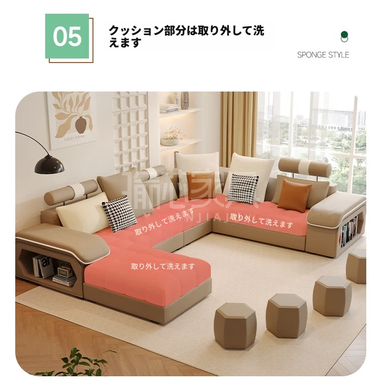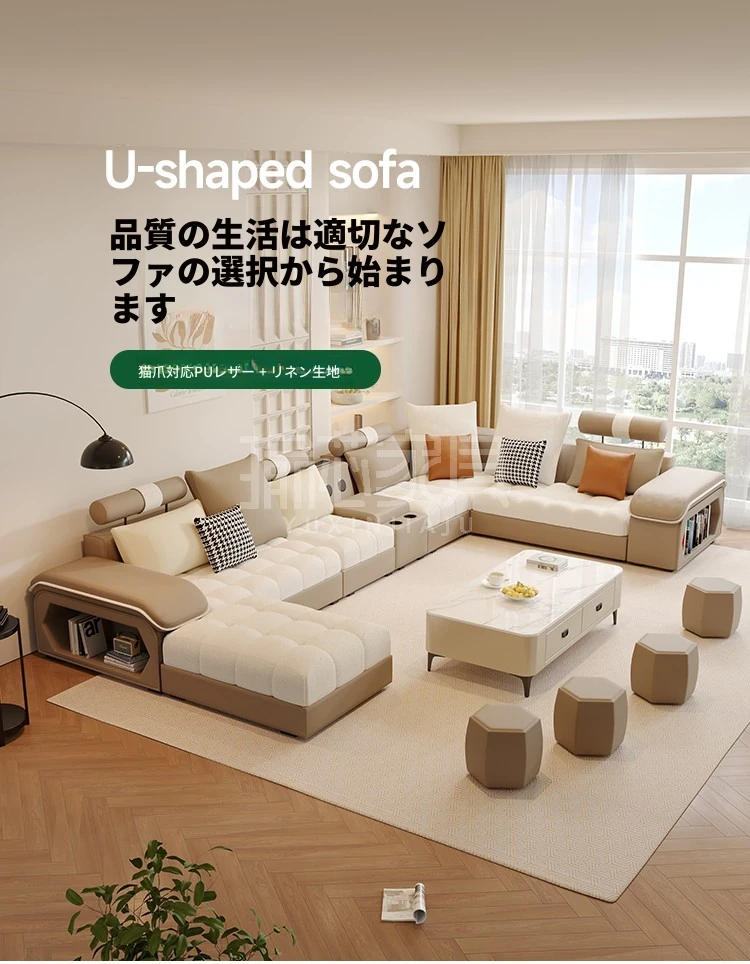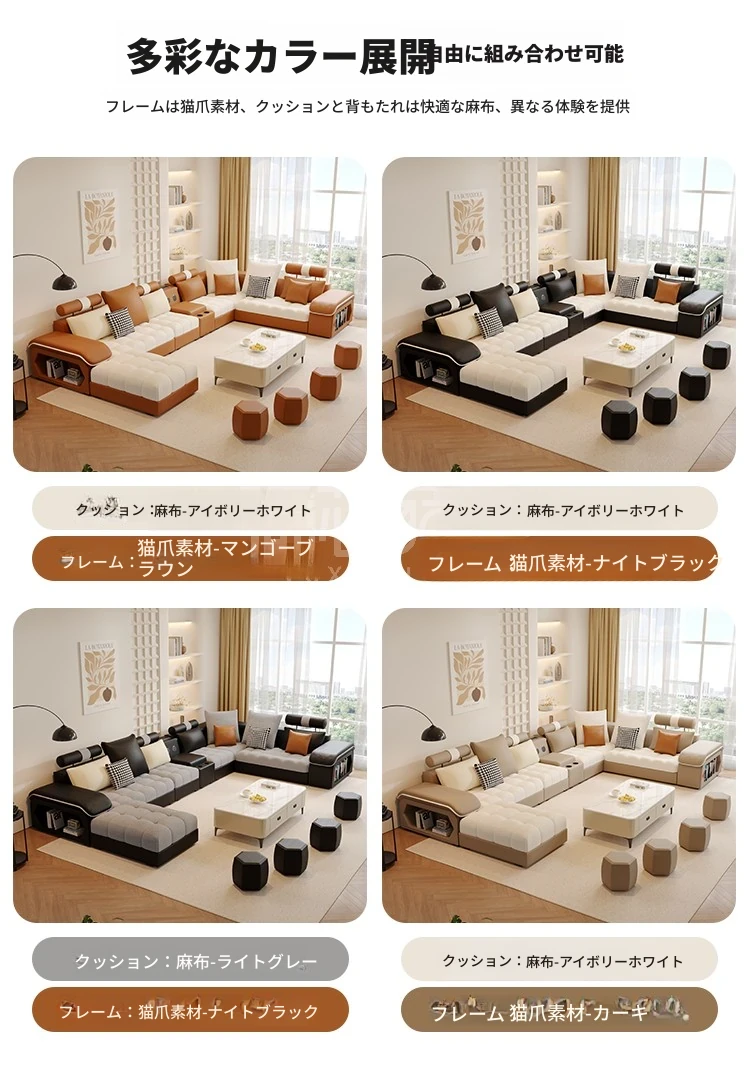 新しいイタリアンミニマリズム猫爪レザーコーナーソファ - 大空間のリビングに最適なシンプルU字型シェーズロングリネン混合ソファセット!モダンでエレガントなデザインが特徴。