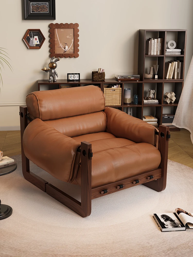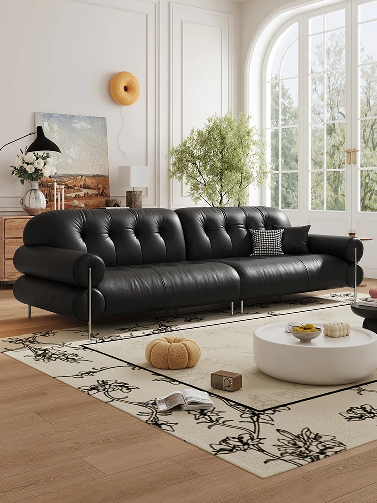 2025年新作:法式レトロスタイルの雲のように快適なハイバックソファ!イタリア風ミニマルデザイン、ブラックレザーと黒糖色の絶妙な組み合わせ。このソファでお部屋に洗練と温かみをプラスしましょう!